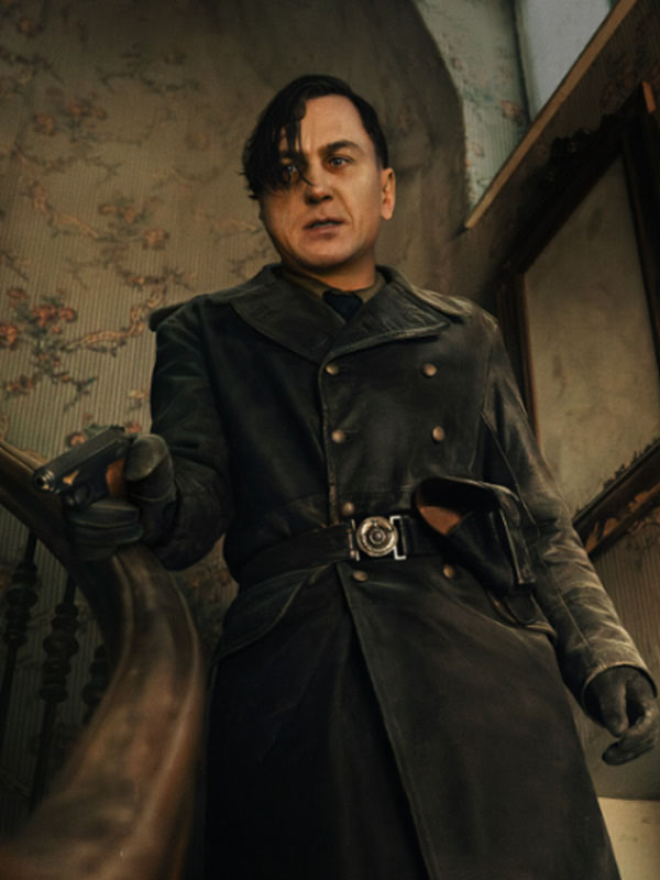 Lars Eidinger All The Light We Cannot See 2023 Sergeant Major Reinhold Von Black Trench Coat