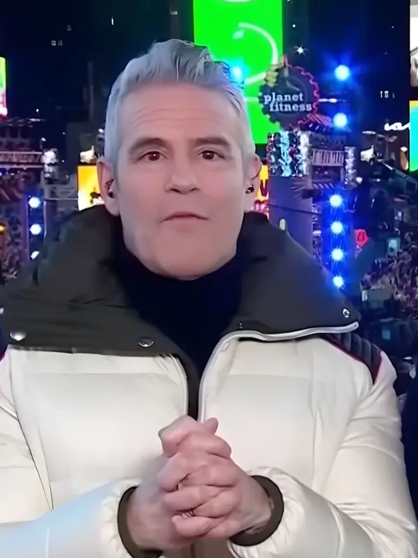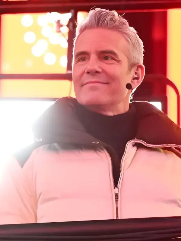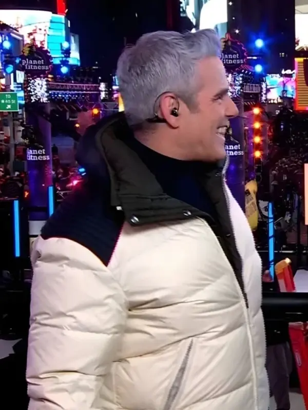 Andy Cohen New Year’s Eve White Puffer Jacket with Stand Collar