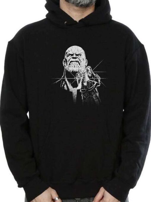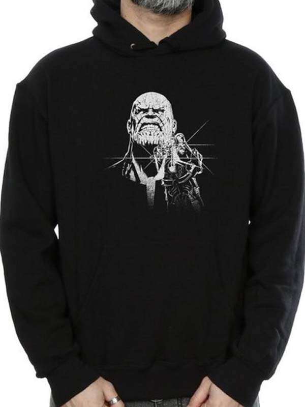 Additionally, a stylish back hoodie is attached which makes it perfect for setting a sturdy look in chilly weather. The full-length sleeves are stitched perfectly with the pullover style. The Thanos logo is printed on the front side of the hoodie which makes it look versatile and unique.