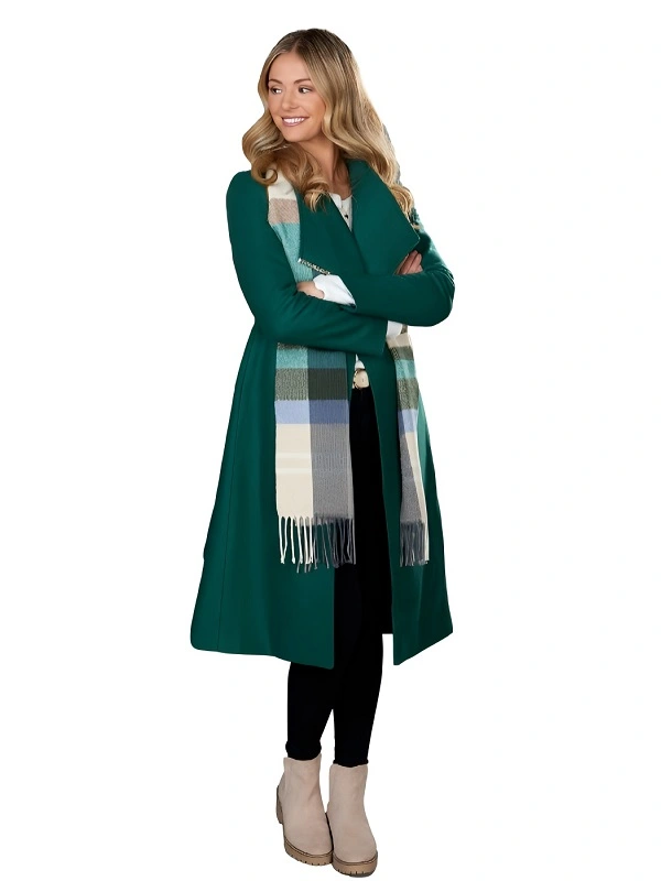 The coat worn by Rebecca Dalton in “Christmas By Design” is described as being made of wool, which suggests warmth and comfort, perfect for the holiday season. The inner lining is made of viscose, ensuring a soft and smooth feel against the skin. The coat features a classic and stylish design with a button and belted closure, making it not only fashionable but also functional for keeping the cold at bay. The lapel collar adds a touch of sophistication to the coat’s overall look. Practicality is not overlooked either, with two outside pockets and an inside pocket for storage and convenience. The full-length sleeves provide extra warmth, and the green color choice is fitting for a Christmas-themed movie, evoking the festive spirit and holiday cheer. This coat is not only a fashion statement but also a cozy and practical choice for the winter season.
