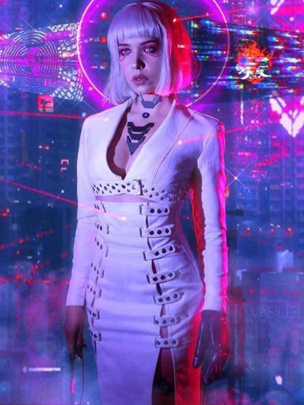 Night City Neon Girl Cyberpunk 2077 White Leather Coat
