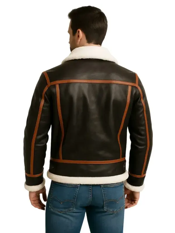 In addition to the features, the brown shearling leather jacket has full-length sleeves and open-hem shearling cuffs which give you full coverage in the cold weather. It also has two outside waist pockets to carry your stuff like cash, cards, and pens. It comes in appealing brown color with an orange-striped design on the front of the bottom.
