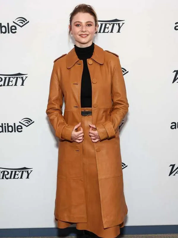 Eileen 2023 Thomasin McKenzie Brown Coat is the perfect way to give your best if you want to style the same as Thomasin! The fine fabrication of this brown coat is held with real leather material along with inner viscose fabric to increase your comfort and smooth finish. It also offers a shirt-style collar, full-length sleeves, and belted hem cuffs. The belted over buttoned closure of this coat adds a quite appealing look to your outlook.