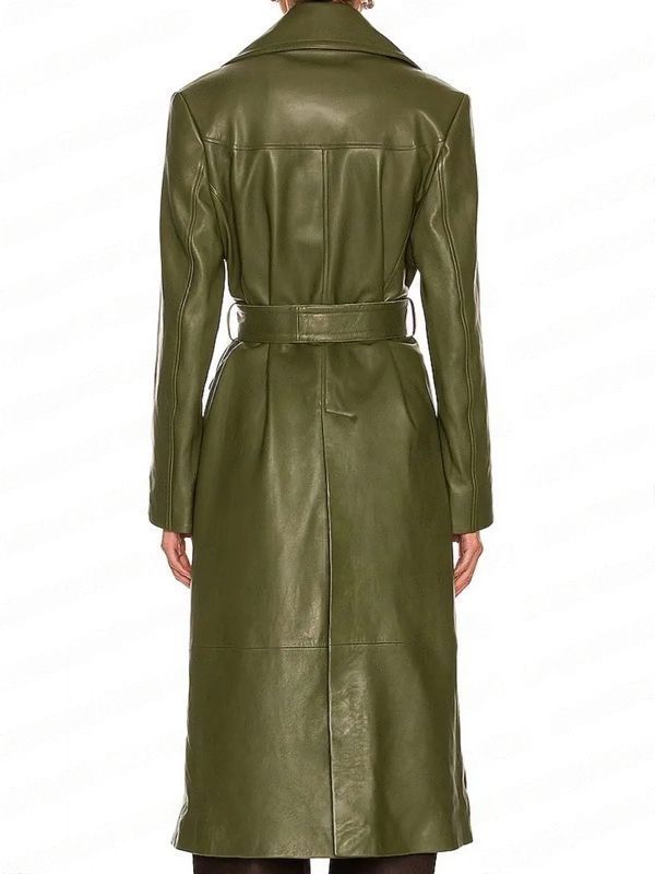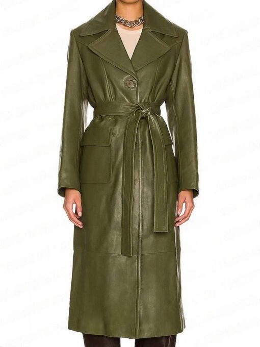 Get the Eleanor Wong Coat! This coat is fabrication of premium quality of real leather and boasts a soft viscose inner lining for enough warmth and comfort. Never Have I Ever Ramona Young Leather Coat is also attributed with a streamlined design, a lapel-style collar and open hem cuffs, front belted closure and two waist pockets. The Eleanor Wong Coat comes in green and provides endless boost and sophistication. Hurry up! Hands on this modern coat for adding warm and maintain your style!