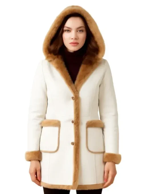 Luxury shearling coats for women is ideal for Winter Fashion Lovers. This coat is a perfect example of beauty in simplicity. Perfectly made for winter fashion enthusiasts. The soft Vegan fur lining keeps you warm on frosty mornings. And the lightweight suede leather allows for easy layering. Whether you are visiting Nordic-inspired destinations. Or just meeting friends at a café. White hooded fur coat will be your best choice for all sort of occasions.