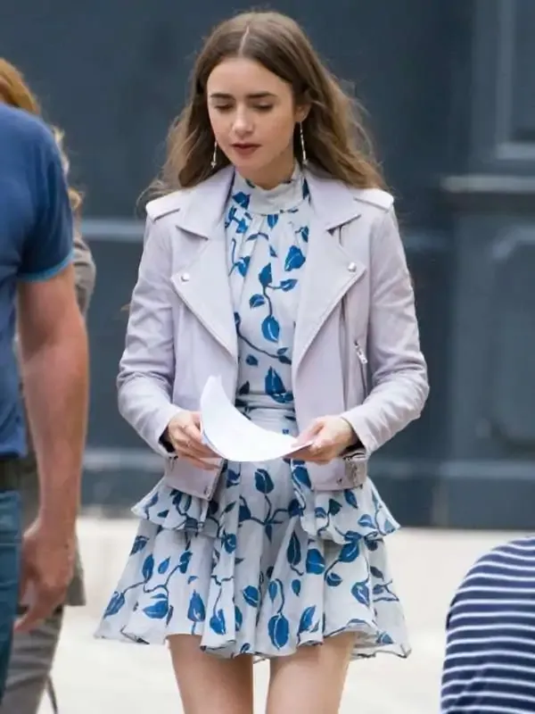 Emily Cooper TV Series Emily in Paris Lily Collins Motorcycle White Leather Jacket