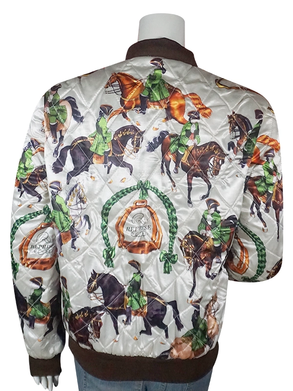The quilted bomber design with horses printed gives it a bold, fashion-forward look inspired by Lily Collins’ style.