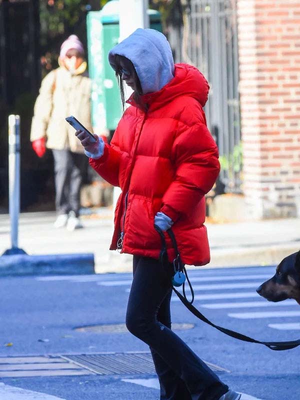 Emily Ratajkowski Red Puffer Hooded Jacket