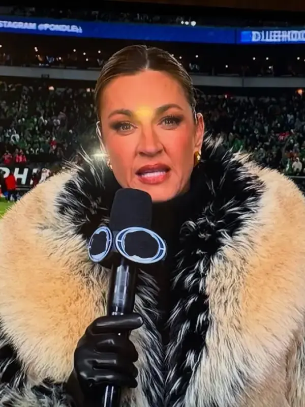 If you searched “Erin Andrews fur coat today,” you already know this look took over the internet during the 49ers vs Eagles playoff game in Philadelphia. Erin Andrews stepped on the field in a bold, oversized coat that instantly became the most talked-about outfit of the day.