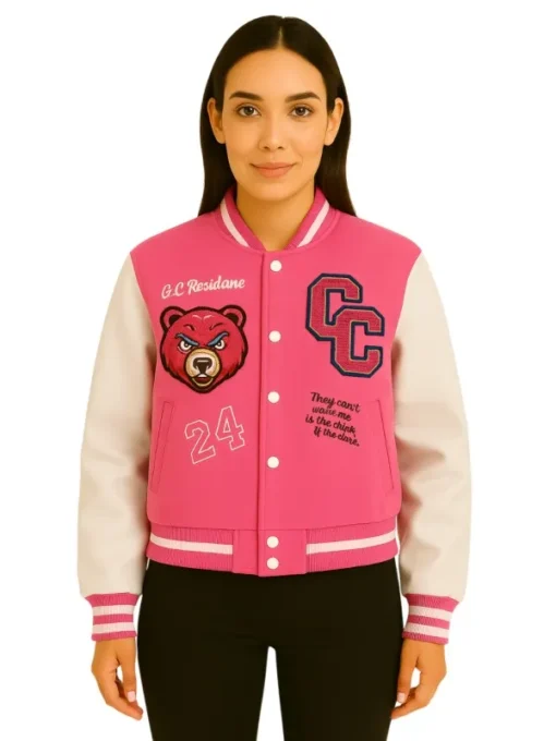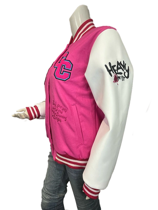 Pop culture varsity jacket is made in pink and white color palette. This combination of funky and playful color combination adds a timeless varsity jacket design for your wardrobe. If you are looking for a street wear jacket or just want a new look to try out this winter, grab this one right away.