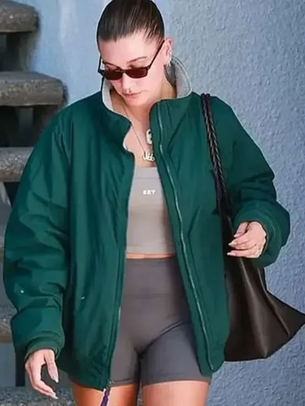 Prepare to flaunt casual dressing with this amazing green bomber jacket. Inspired by the famous celebrity Hailey Bieber when she is going off to Pilates. The look is quite sporty and trendy making it a versatile wardrobe piece. Hailey Bieber Pilates Class Green Bomber Jacket is stunning outfit that you do not want to miss at all.