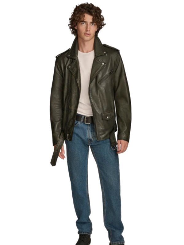 This leather jacket’s asymmetrical design is finished with snaps at the collar and lapel, giving you control over how open or sharp you want the neckline. The zipper-style cuffs add that true moto energy and help lock in warmth when the weather turns. Plus, the attached half belt tightens the look around the waist, keeping the jacket crisp instead of boxy.