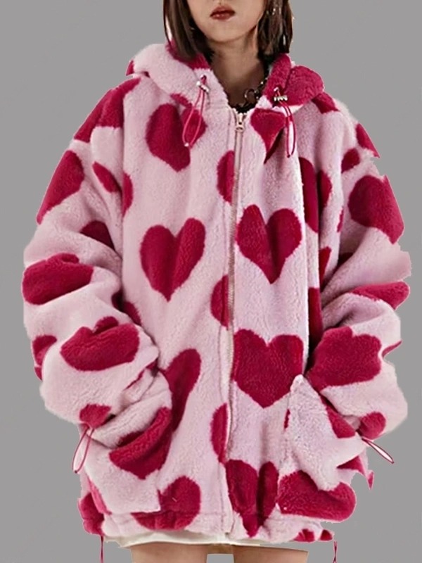 Heart All Over Oversized Pink Shearling Hooded Coat
