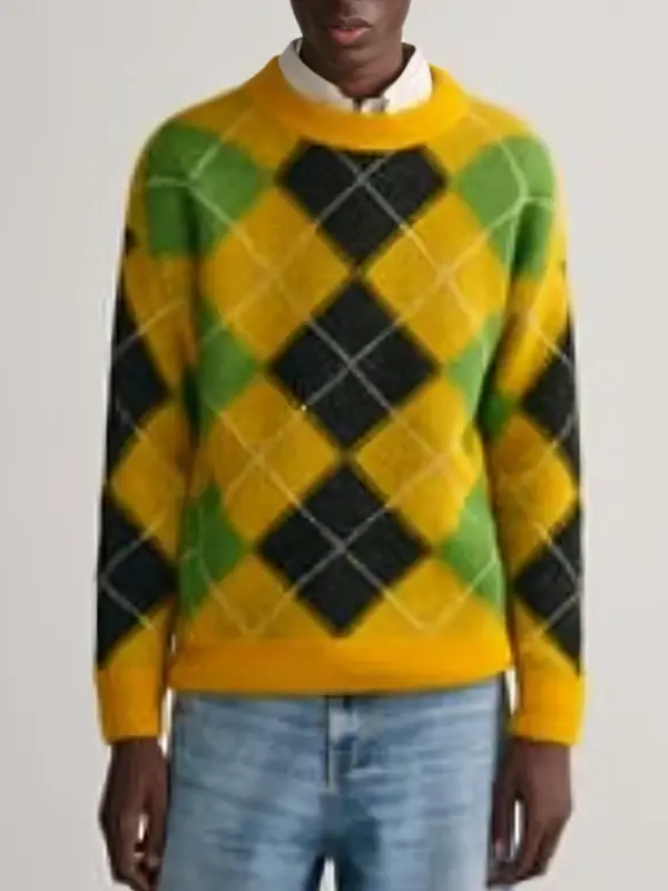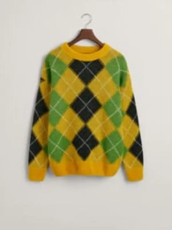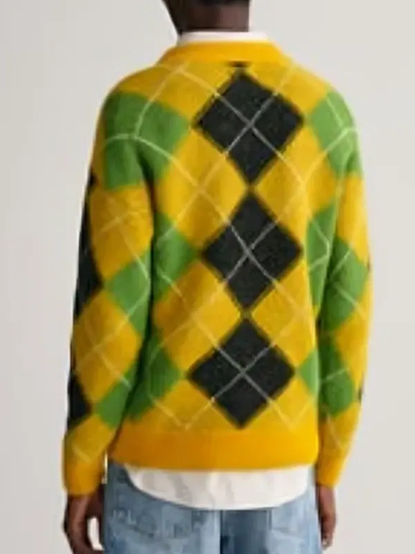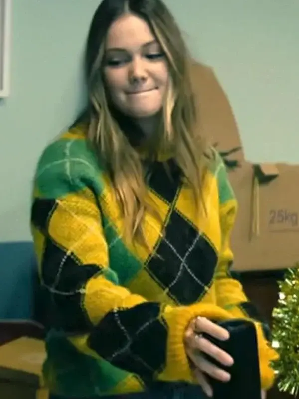 Buy The Sophia Jingle Bell Heist 2025 Olivia Holt Yellow Argyle Fuzzy Sweater