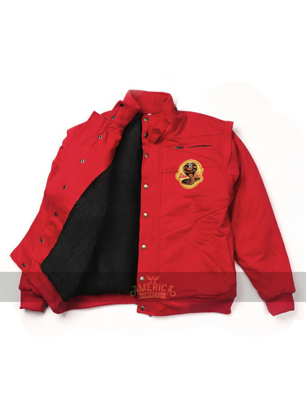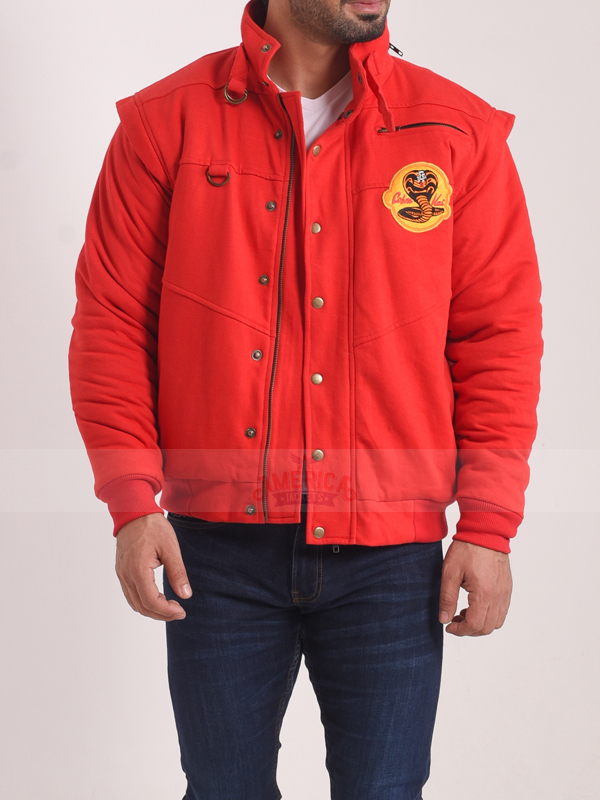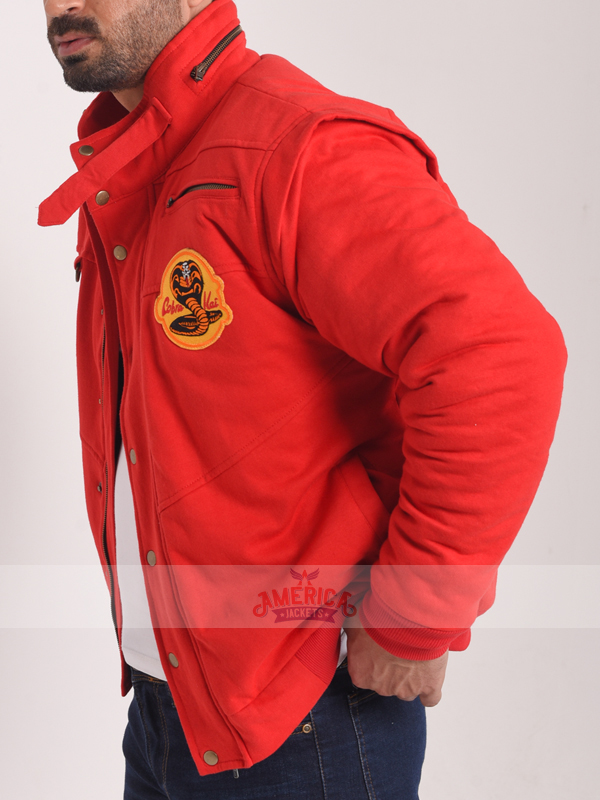 Additionally, the sleeves feature precision-ribbed cuffs for anatomical flexibility. These zones allow fluid movement without losing Fit Retention. Whether you are at a dojo or on the street, this jacket delivers undisputed quality metrics. It merges “Strike First” design with dual-needle seams for industrial-grade longevity. This is the undisputed choice for Johnny Lawrence Red Cobra Kai Jacket collectors seeking authentic engineering.