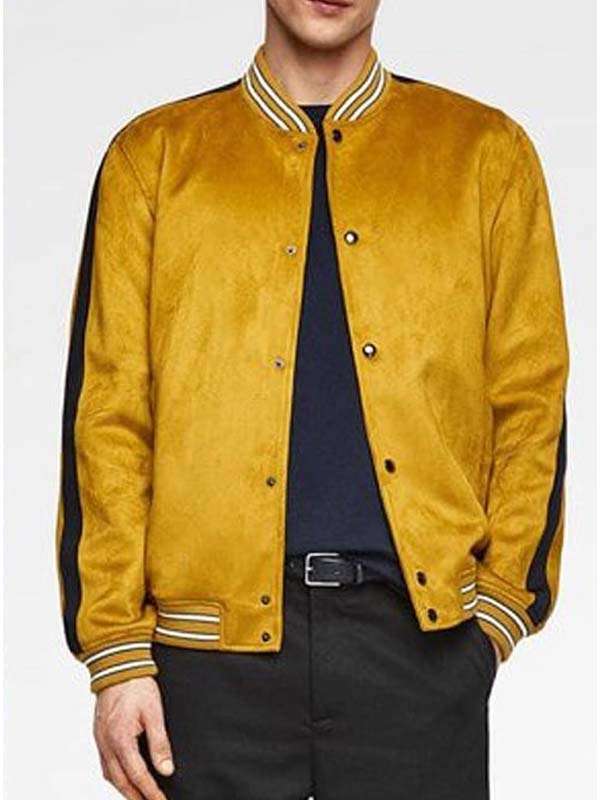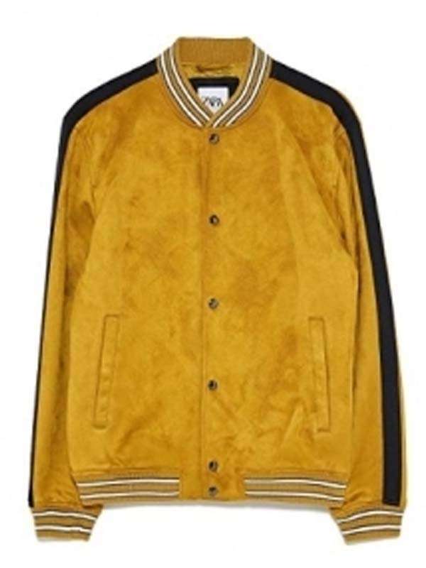 This in-vogue Marcus Scribner Black-ish Yellow Suede Bomber Jacket is made with excellent Satin fabric. It is further accommodated with a stand-up style rib-knitted collar, full-length sleeves with creased configuration, rib-knitted cuffs, two midsection pockets outside, two pockets inside, an appealing mustard color as shown in the picture, and buttoned closure adds more allure in this piece.