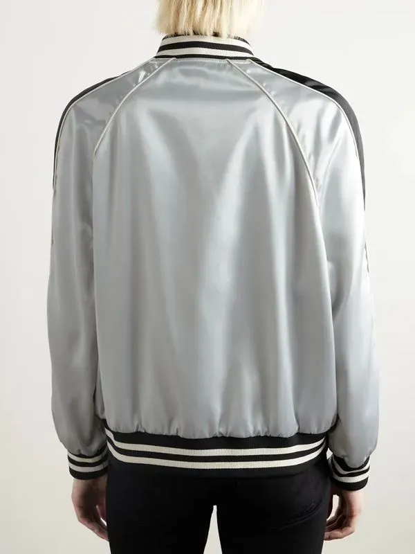 This jacket is made of soft satin on the outside to provide a smooth and shiny finish. The inside is provided with a soft viscose lining that makes you feel comfortable everywhere you go. The Lady Gaga satin bomber is designed with rib-knitted cuffs and collar to provide a sporty touch while maintaining the perfect fit. The outfit is comfortable to wear because of the snap-tab button closure on the front. It also provides the jacket with a tidy, sleek look. With one pocket each on the waist and one inside, you have got enough room for all your little things. The combination of grey and black colors and the stripes provides the jacket with a bold, fashion-forward style. Making the jacket a versatile choice for everyone.