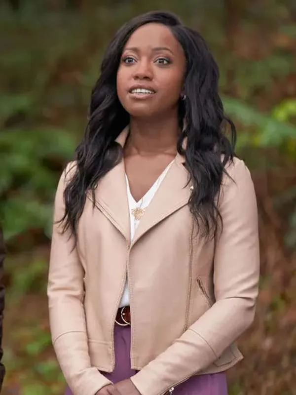 Legend Of The Lost Locket 2024 Amelia Scott Beige Biker Leather Jacket