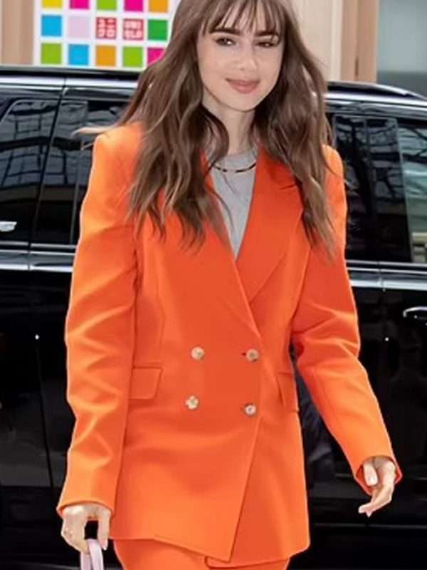 Comes in genuine suiting material this must-have Movie Windfall 2022 Promotion Lily Collins Orange Suit is tailored with a soft viscose lining to keep you warm and comfortable. To give an alluring vibe, it has a front double-breasted buttoned closure with a collar having a tremendous peak lapel style and long sleeves along with open hem cuffs. Tempting orange in color, this blazer provides an invigorating look perfect to upscale your persona with two outside pockets for holding your stuff safely.