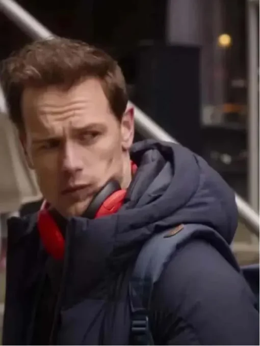 Sam Heughan Love Again 2023 Rob Burns Blue Puffer Hooded Jacket