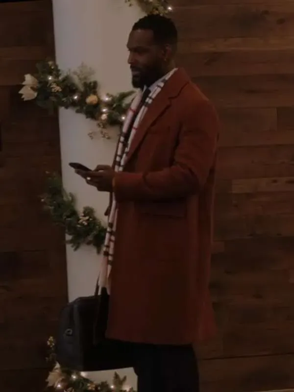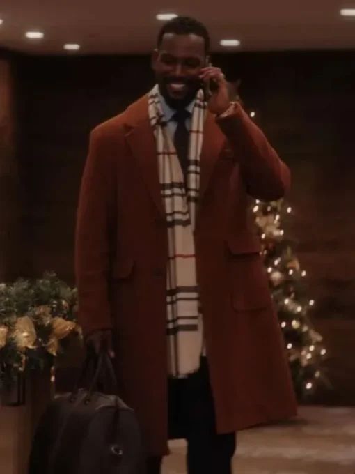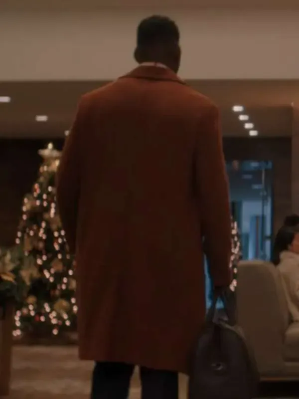 The Kofi Siriboe brown coat Meet Me Next Christmas design is not only aesthetic but also functional. There are three spacious pockets on the front and two on the inner side. This means you have enough space to carry your essentials. Be at ease to carry your phone, wallet, or keys. Such details make it a convenient choice for everyday wear.