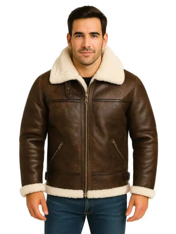 Leather jackets had always been remain an attire of choice for men of all ages. Dark brown leather jacket is a perfect attire for you, if looking for something that stand you out of crowd then Sheepskin Bomber dark brown leather jacket is the desired jacket. Lapel style white shearling collar with inner shearling lining makes the jacket cozy, warm and comfortable. Strip detailing on long slim fit sleeves with white shearling outline and with shearling hemline give cozy and warm feeling in the winter. Two zipper waist pockets are also added to keep the necessary items. Men B3 Sheepskin Bomber Jacket is now available on a very affordable prices, so grab it now.