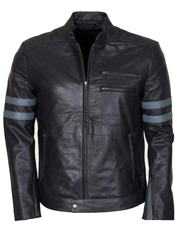 This Black Leather Cafe Racer Jacket is composed of real leather and augmentation of an inner stitched viscose lining to keep you comfortable. Its features accommodate an erected collar, zipped cuffs, blue stripes at the sleeves, snap-tab hemline, and front zipper closure. The jacket also has two zippers at the chest, two zipper pockets at the waist, and two inside pockets to carry your storage easily.