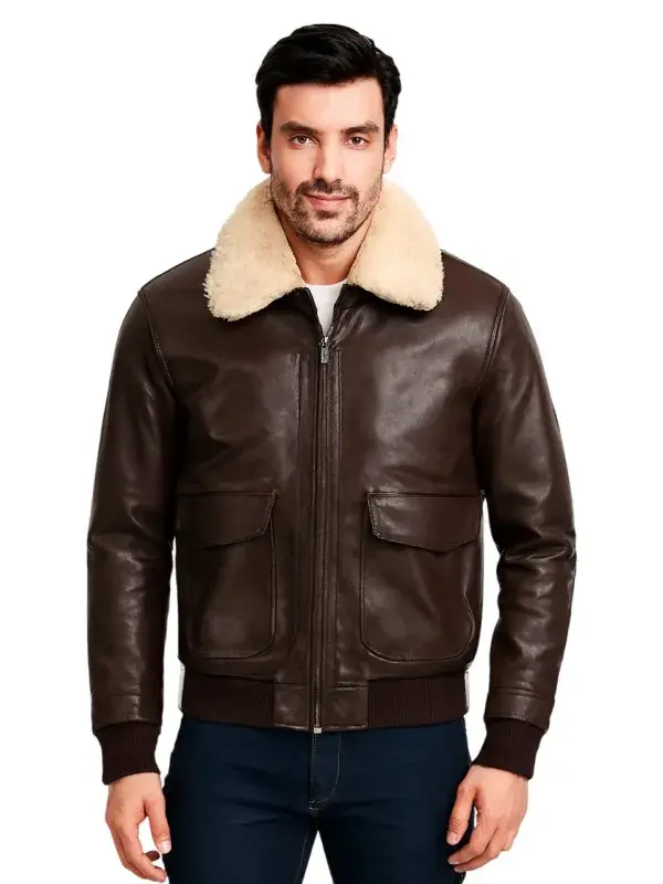 Men white shearling chocolate brown leather jacket White shearling brown leather jacket is designed with high quality pure leather and internally provided with soft shearling lining to so that cold winter waves don’t penetrate and you can enjoy the cold winter with cozy and comfortable feelings. Men Pilot shearling brown leather jacket is crafted with great skills to give the jacket exact appearance that you see on your screen. We have featured the Men pilot leather jacket with dual front zipper closure and snap tab buttoned closure. Long slim fit sleeves and hemline furnished with rib knitted cuffs and rib knitted hemline that give you comfortable and cozy feeling all day long. Two big size flap waist pockets are also fastened to help you keep your necessities with you. Leather striped shoulder epaulets and leather strip detailing on the back with white shearling fur white collar is an addition to the classy look of the jacket.