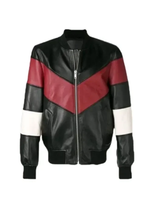 Men Chevron Stripe Bomber Leather Jacket