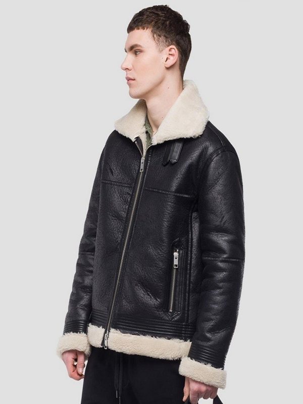 it is prepared with fine quality real leather and shearling lining is there. Men classic B3 leather jacket look extraordinary hot and classy with its jet black color, Front zipper closure and shearling white fur lapel style Men Classic B3 Shearling Jacketbroad collar, you can make it stand up erect color with two adjustable leather strips on the collar. Stylish detailing on the hemline and cuffs of long fitted sleeves add charm and charisma in the magnificent appearance of the jet black color Men Classic B3 Shearling Jacket. Two Slanted zipper pockets are also there along with shearling white fur on hemline to give warm and cozy feeling in the harsh cold winter. All the features of the Black Classic B3 leather jacket are eye catching, appealing and very charming that wills surely give you classy persona and charismatic look when you make it your attire for the party or family dinner, everyone surrounding you will appreciate you for such a fine taste in jackets.