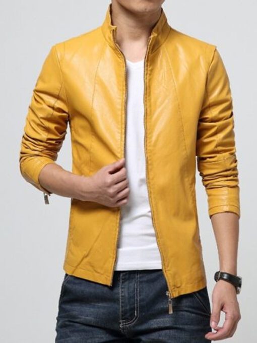 In this article, we have offered you this amazing-looking jacket. The jacket is designed of leather, the inside is lined with viscose material. The sleeves of the jacket are full-length with zipper cuffs. The front is concluded with a zipper. It has a stand-up style neckline. It comes in appealing yellow color. This garment is sure to stun you with its luxuriously comfortable fit and styling.