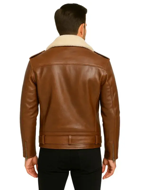 Shearling Collar Brown Leather Biker Jacket For Men