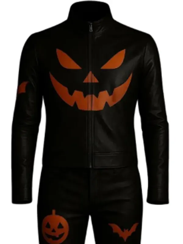 Mens Pumpkin and Bat Printed Black Leather Jacket