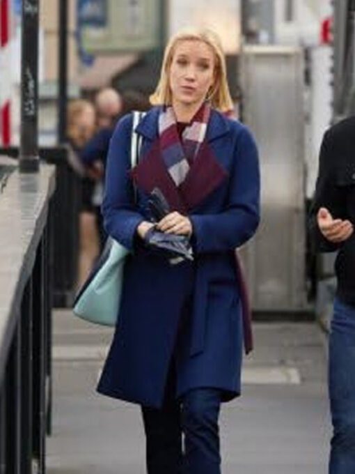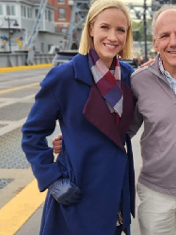 Jessy Schram Mystic Christmas 2023 Juniper Blue Trench Coat