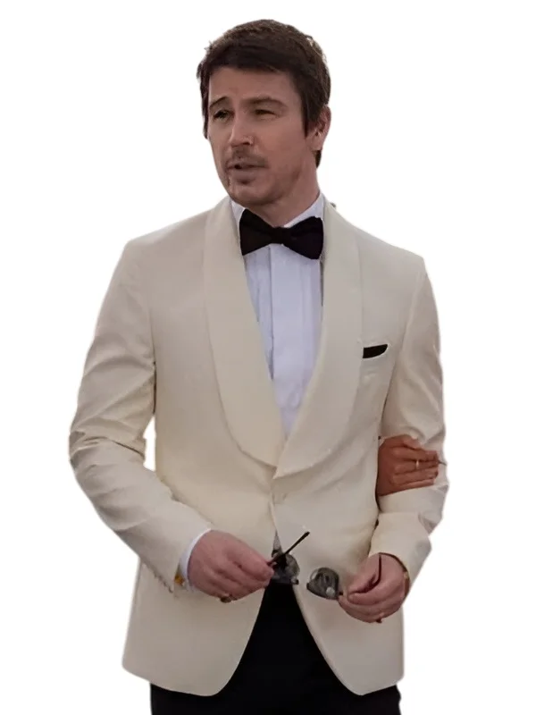 The charming white blazer is spotted worn by Josh Harnett graciously in the spy-action movie Operation Fortune Ruse De Guerre 2022. Suiting material is used to design which gives a formal look while the inside is tailored with viscose fabric which adds a soft and smooth sensation. It has a unique lapel-style shawl collar. A single button closure is a compliment for this coat. The white coat has long sleeves are concluded with buttoned cuffs.