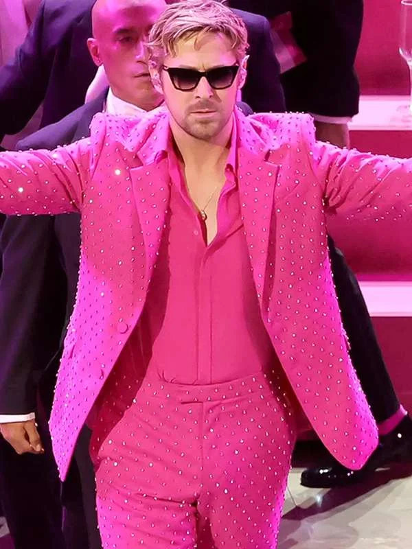 An extended look from his Hit movie The Barbie, this Ryan Gosling Suit is crafted from luxurious suiting material, which exudes sophistication and elegance. The soft pink color adds a touch of playfulness while still radiating confidence and charm of an amazing looking man. Paired with a classic lapel collar and full-length sleeves, this suit strikes the perfect balance between modernity and timeless appeal.