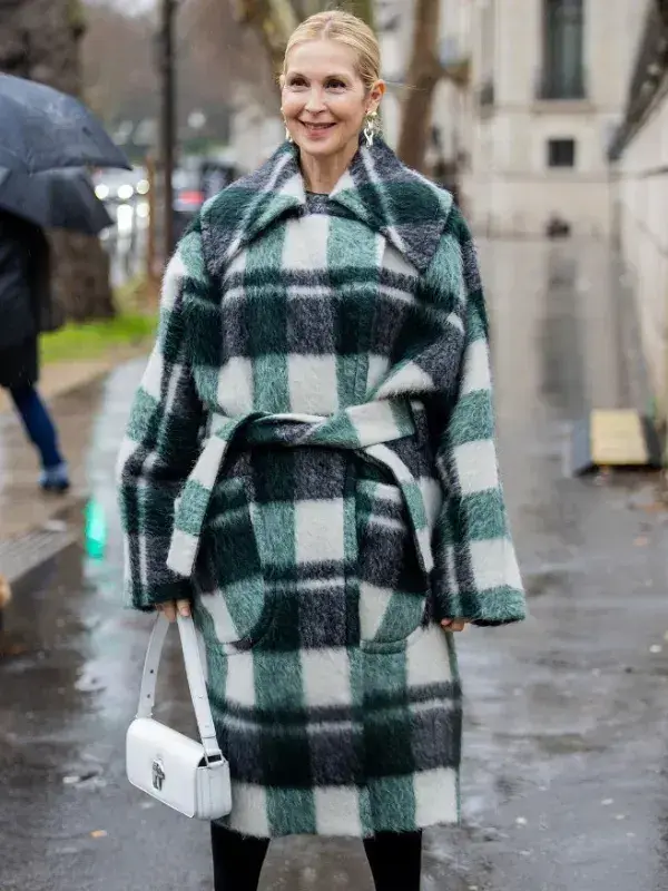 2026 Kelly Rutherford Wrap Coat Paris Fashion Week Bell Sleeves, Green, Grey & White Check Oversized Wrap Coat