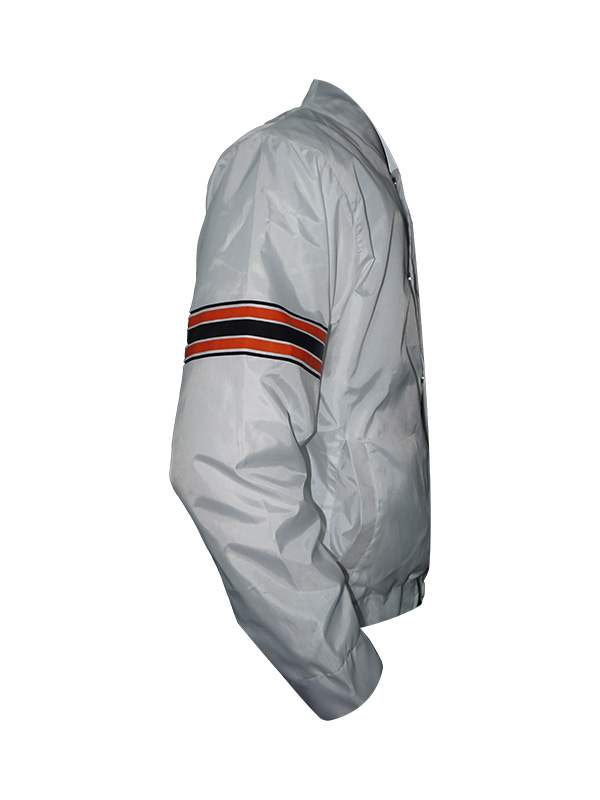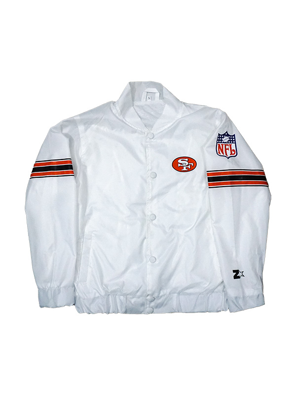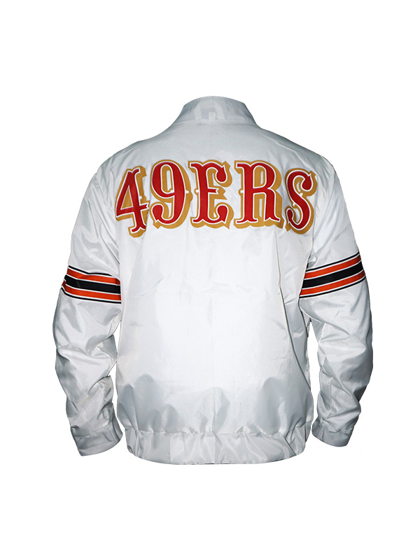 Moreover, the Vibrant white color of the power forward san Francisco 49ers white jacket is further installed with a stylish rib-knit collar, full-snap buttoned front fastening, full-length sleeves with flexible ribbed cuffs, rib-woven waist bottom, two front slip pockets with two inside secret pockets, and multiple colored stitched-on fabric stripes on both sleeves.