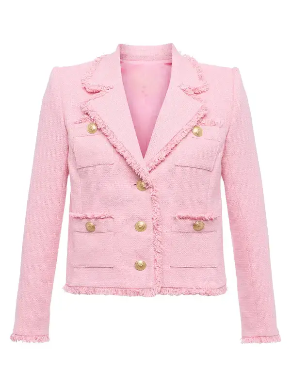 This l’agence pink jacket is crafted from a cozy tweed fabric. It is silky in texture and feels comfortable on the skin. Making it ideal to wear all day long when outside easily.