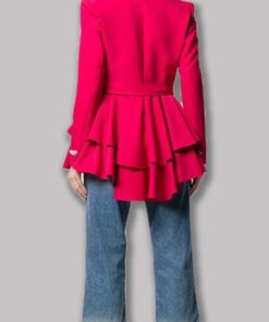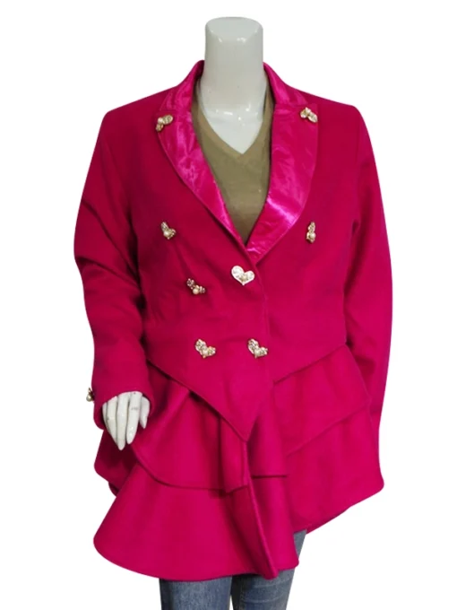 Keeley Janes Ted Lasso Pink heart buttoned blazer is the best attire that you should add in your wardrobe and impress the people with your amazing sense of dressing and appealing persona. The silver heart shaped buttoned double breasted closure with stylish frock style frill detailing make it overwhelming