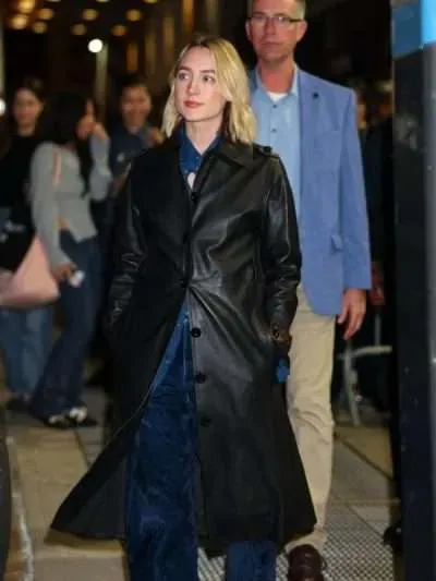 Saoirse Ronan leather fashion is further enhanced by the classic buttoned closure on the front. This provides a classy and stylish look. The buttoned style makes it easy to wear and take off when needed.