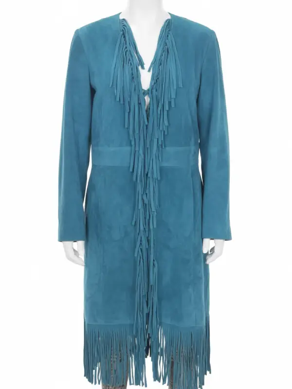 Crafted from premium suede, the coat drapes smoothly while the long, fluid fringe moves with every step, echoing the same energy Reba showed during her coaching moments. Fans instantly recognized the reba McEntire blue fringe coat from her live show appearance at Universal Studios Los Angeles, where she wore the bold turquoise shade under the bright studio lights. Because of this vibrant tone, the coat adds a dramatic finish to any outfit, whether you’re heading to an evening event or creating your own standout moment.