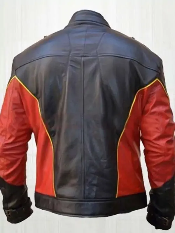 This fabulous jacket is available with red and black color contrast that sets a unique look. Tim Drake Leather Jacket is designed with synthetic leather with an open hem cuff and delicate needlework. Its two-sided pockets and yellow stripe design with buckle style collar gave this jacket a stunning look. Its front open closure and viscose lining enhance the comfort.