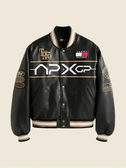 Tommy Hilfiger x APXGP x F1 Movie Black Leather Racing Varsity Jacket