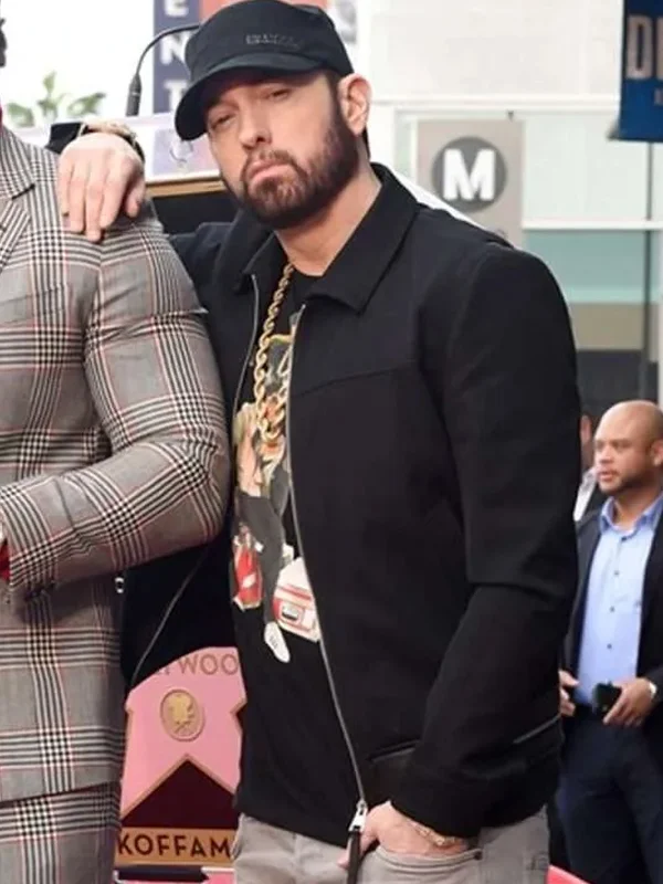 Get the touch of music style, hip hop touch in chic Eminem appearance black jacket. In a world where fashion and music often cross paths, this attire stands as a great look of Eminem which is a treat for his fans.