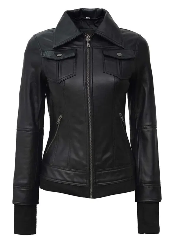 Be the first to review “Womens Black Bomber Leather Jacket​ With Removable Hood”