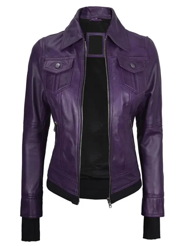 Shop the Trendy Womens Purple Leather Bomber Jacket With Removable Hood for a Chic Everyday Look