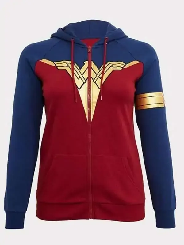 Designed exceptionally with high-quality fleece fabric, the Wonder Woman Red and Blue Sweatshirt is what covers this year to you. Its relishing properties include a classic front zipper closure, enchanting hooded collar with drawstrings, rib-knitted cuffs, adjustable hemline, and kangaroo inner pockets. It least but not last feature, the sweatshirt’s eye-catching fusion of red and blue colors with a golden printed logo of Wonder Woman, this one will create effortless look wherever you’ll go! Add this one to your shopping list without any second thought!