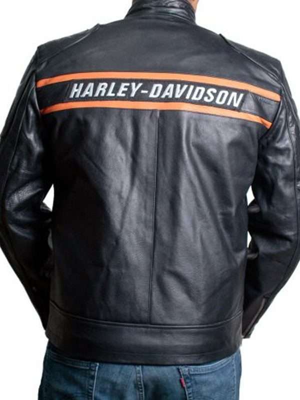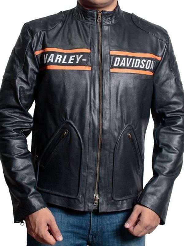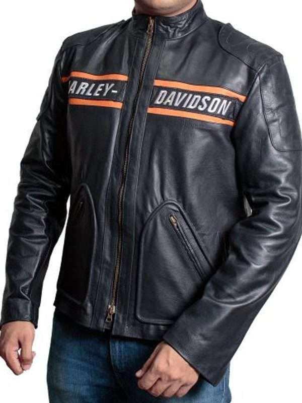 We bring for his die-hard fans, this outwear piece with all fine detailing from choosing the real leather to infusing soft viscose lining on the inner. It further attributes like, a full front zip fastening, zipped cuffs, and padded shoulders. The most noticeable detail is in this wear, the Harley Davidson logo on the front side of the jacket.