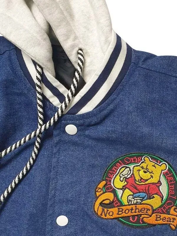 This Winnie the Pooh Denim Varsity Jacket is not just for Winnie the Pooh fans its for anyone who appreciates high quality casual fashion with a touch of whimsy It speaks to men and women alike offering a charming jacket that complements any style Whether you are reliving your favorite childhood memories or simply looking for a comfortable stylish jacket his piece is a perfect choice.